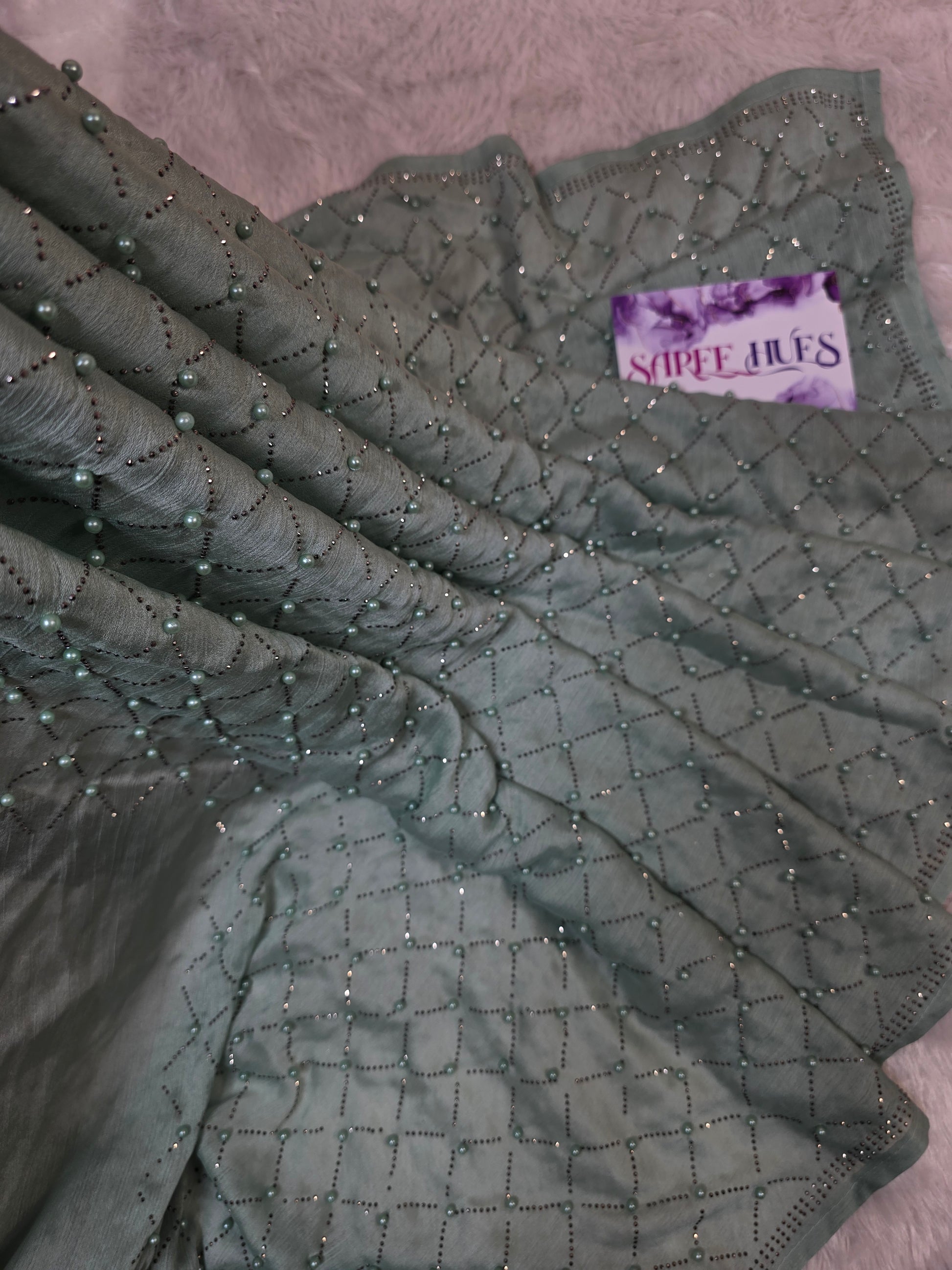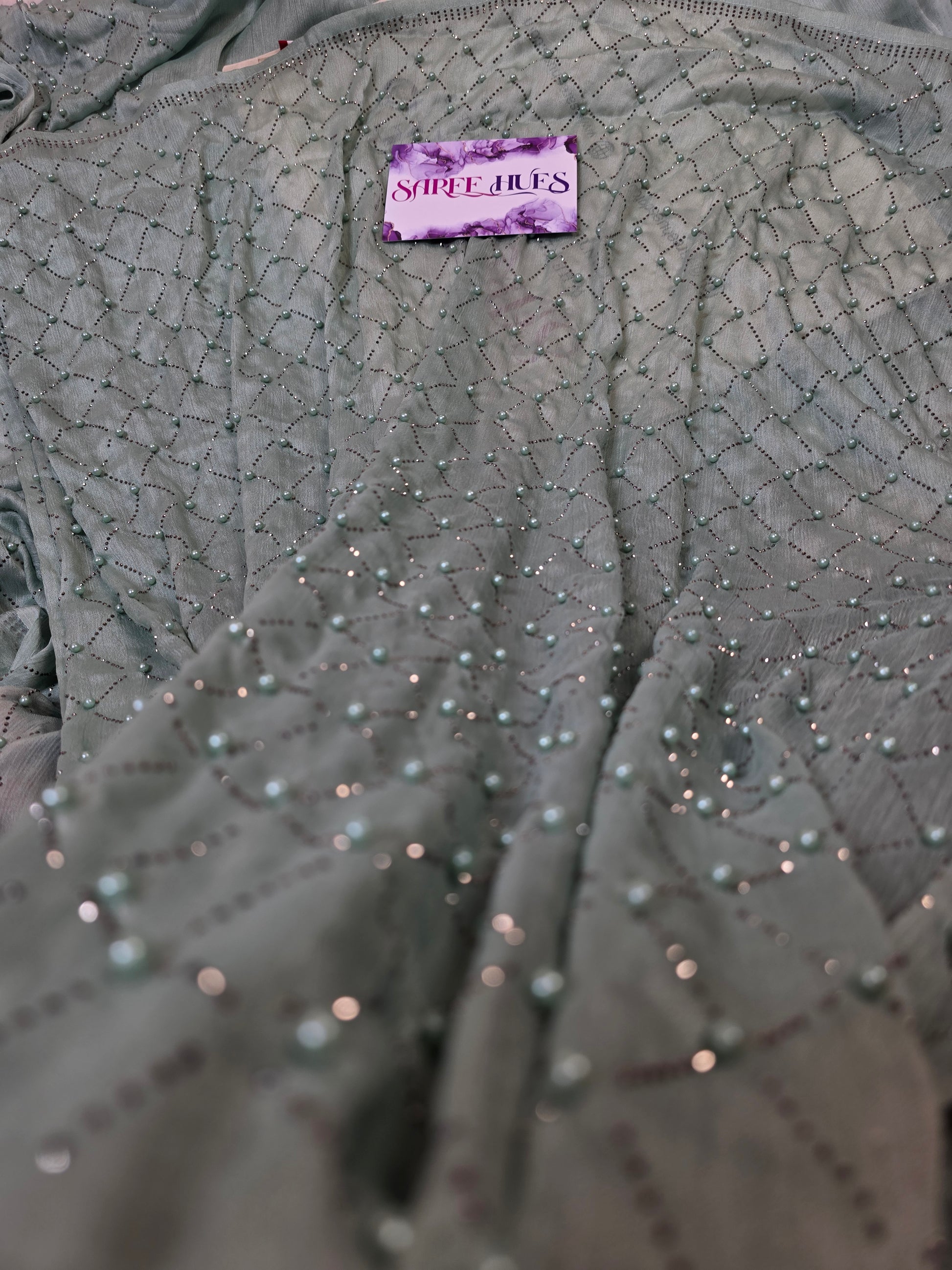 Ethereal Sage Green Shimmer Saree with Geometric Pearl & Stone Lattice Work